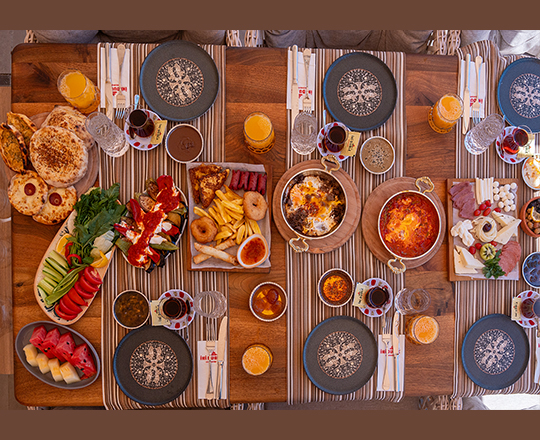 İçindekiler:Beyaz Peynir, Örgü Peyniri, Çeçil Peyniri, Misket Peyniri, Van Otlu Peyniri, Çubuk Peynir, Tereyağı, Acuka, Reçel 2 Çeşit Bal, Kaymak, Tahin Pekmez, Çikolata, (Siyah Zeytin, Kırma Yeşil Zeytin) Baharatlı Zeytinyağı ,Domates, Salatalık, Yeşillik Tabağı, Yoğurtlu Kızartma, Kavurmalı Yumurta, Menemen, Dana Jambon, Salam, Patates Tava, Sigara Böreği, Mini Pide, Pişi Kavun Karpuz, Sınırsız Çay ve Taze Portakal Suyu